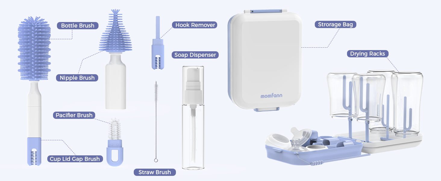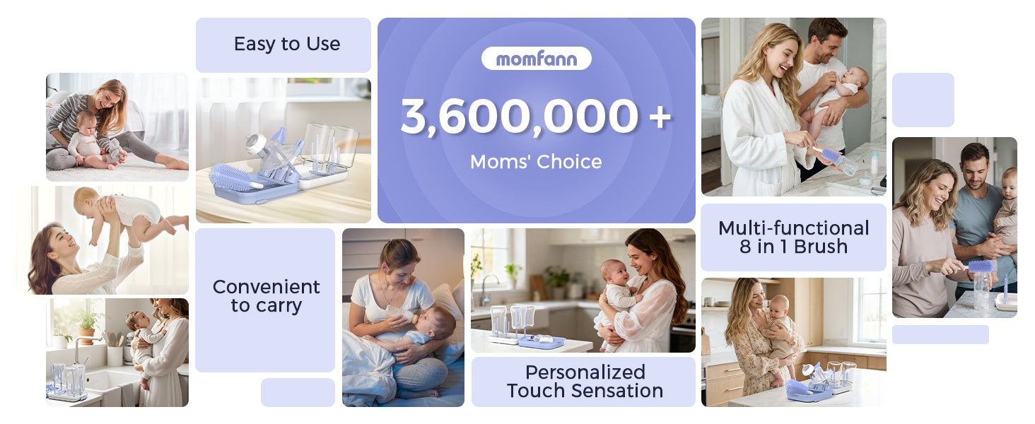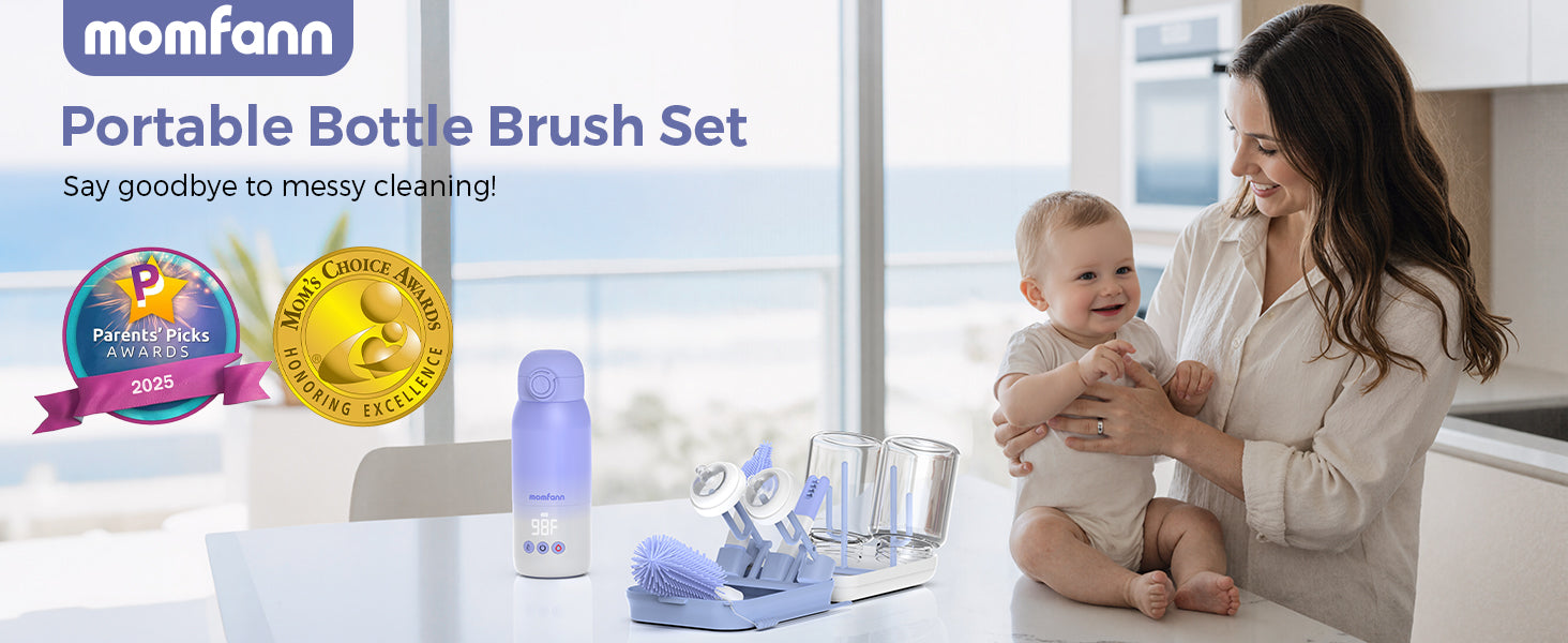 The Momfann 8-in-1 Magnetic Baby Bottle Brush Set provides a complete cleaning solution for baby bottles, nipples, straws, and breast pump parts. With soft silicone brushes, a magnetic storage stand, and a compact drying rack, it keeps feeding essentials clean, organized, and ready for everyday use — perfect for new parents who value hygiene and convenience.