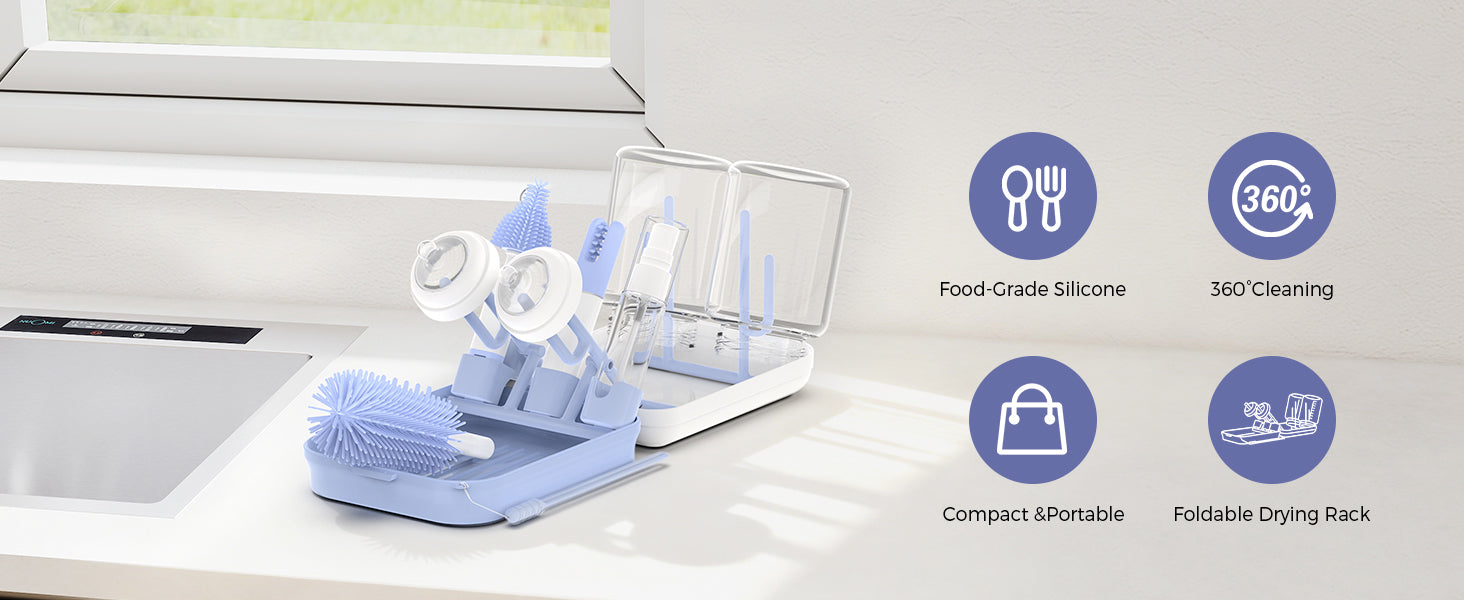 Soft food-grade silicone cleans effectively without damaging baby items. - Built-In Drying Rack